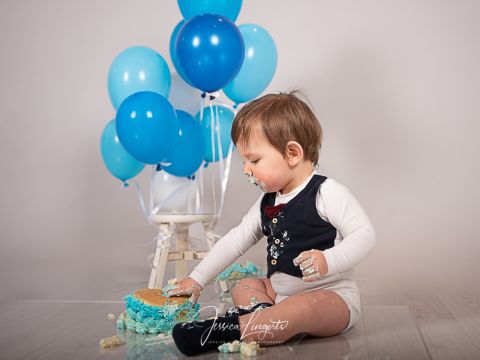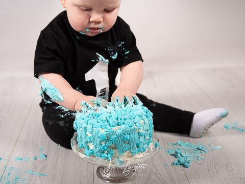 Smash-the-cake sessionen börjar med att vi tar "klassiska" 1-årsporträtt, då finns det möjlighet för eventuella syskon eller hela familjen att vara med på någon bild. Under tiden ni gör ett ombyte till mer oömma kläder så dukar vi fram tårta, ballonger och andra dekorationer efter det färgtema ni har valt. Barnet får därefter ta för sig av tårtan på det sätt barnet själv önskar. Smaka, känna, kladda och leka! Efter smash-the-cake sessionen har ni tillgång till dusch.