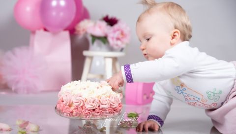 En blivande 1-åring som får en alldeles egen tårta! Vissa barn tvekar inte en sekund och hänger sig med både händer och fötter i den gräddiga skapelsen, andra barn vet inte riktigt vad dom ska göra utan närmar sig med viss försiktighet. Ibland är det till och med så att någon medföljande förälder får rycka in och visa.